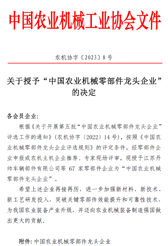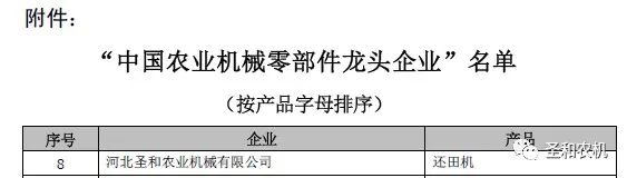 2023年3月9日,中國農(nóng)業(yè)機械工業(yè)協(xié)會發(fā)布關(guān)于授予“中國農(nóng)業(yè)機械零部件龍頭企業(yè)”的決定(農(nóng)機協(xié)字[2023]8號文件),河北圣和農(nóng)業(yè)機械有限公司位列榜單,以優(yōu)秀的配套還田機零部件而著稱。