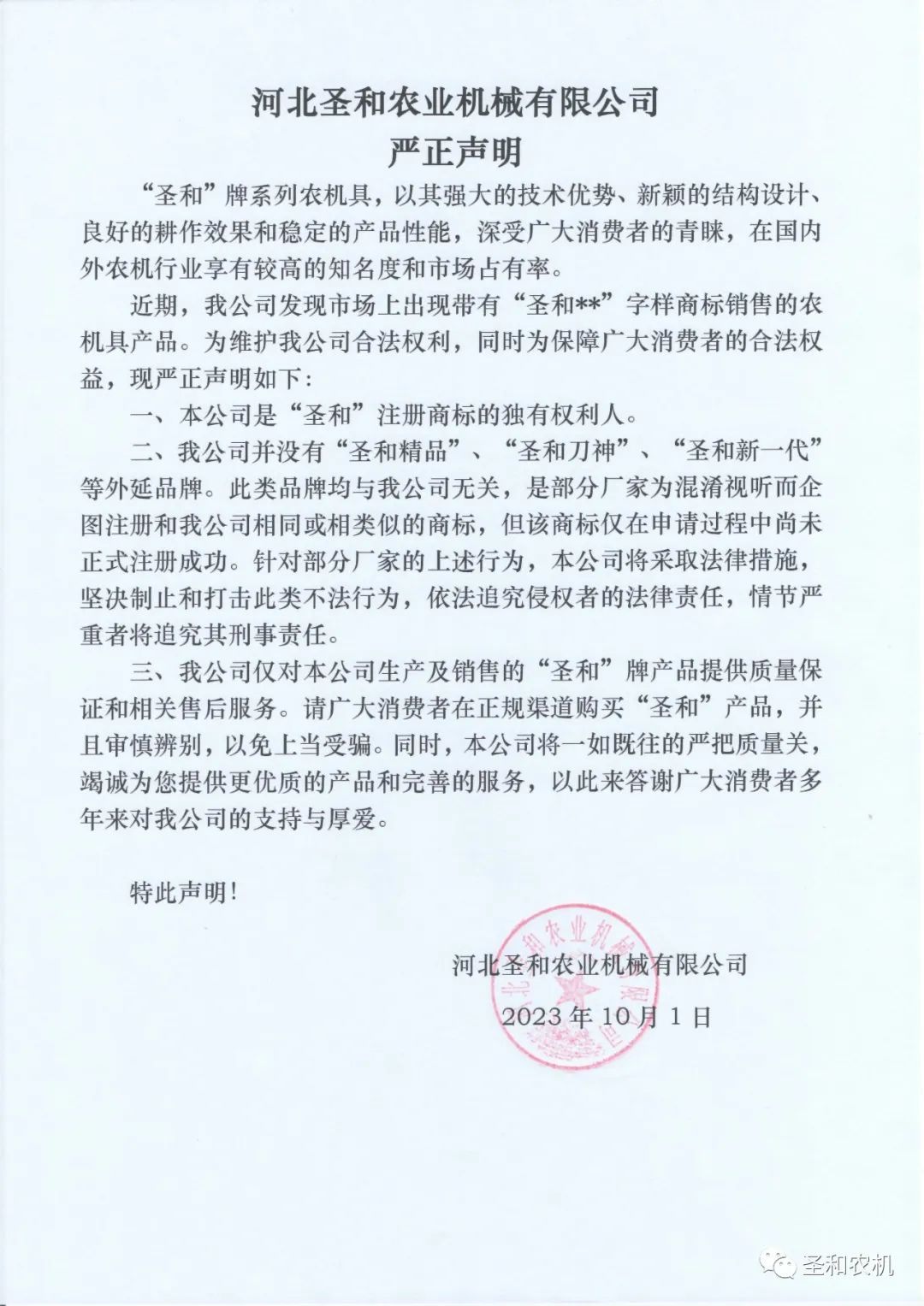 “圣和”牌系列農(nóng)機(jī)具,以其強(qiáng)大的技術(shù)優(yōu)勢、新穎的結(jié)構(gòu)設(shè)計、良好的耕作效果和穩(wěn)定的產(chǎn)品性能,深受廣大消費(fèi)者的青睞,在國內(nèi)外農(nóng)機(jī)行業(yè)享有較高的知名度和市場占有率。 近期,我公司發(fā)現(xiàn)市場上出現(xiàn)帶有“圣和**”字樣商標(biāo)銷售的農(nóng)機(jī)具產(chǎn)品。為維護(hù)我公司合法權(quán)利,同時為保障廣大消費(fèi)者的合法權(quán)益,現(xiàn)嚴(yán)正聲明如下: 一、本公司是“圣和”注冊商標(biāo)的獨(dú)有權(quán)利人。 二、我公司并沒有“圣和精品”、“圣和刀神”、“圣和新一代”等外延品牌。此類品牌均與我公司無關(guān),是部分廠家為混淆視聽而企圖注冊和我公司相同或相類似的商標(biāo),但該商標(biāo)僅在申請過程中尚未正式注冊成功。針對部分廠家的上述行為,本公司將采取法律措施,堅決制止和打擊此類不法行為,依法追究侵權(quán)者的法律責(zé)任,情節(jié)嚴(yán)重者將追究其刑事責(zé)任。 三、我公司僅對本公司生產(chǎn)及銷售的“圣和”牌產(chǎn)品提供質(zhì)量保證和相關(guān)售后服務(wù)。請廣大消費(fèi)者在正規(guī)渠道購買“圣和”產(chǎn)品,并且審慎辨別,以免上當(dāng)受騙。同時,本公司將一如既往的嚴(yán)把質(zhì)量關(guān),竭誠為您提供更優(yōu)質(zhì)的產(chǎn)品和完善的服務(wù),以此來答謝廣大消費(fèi)者多年來對我公司的支持與厚愛。