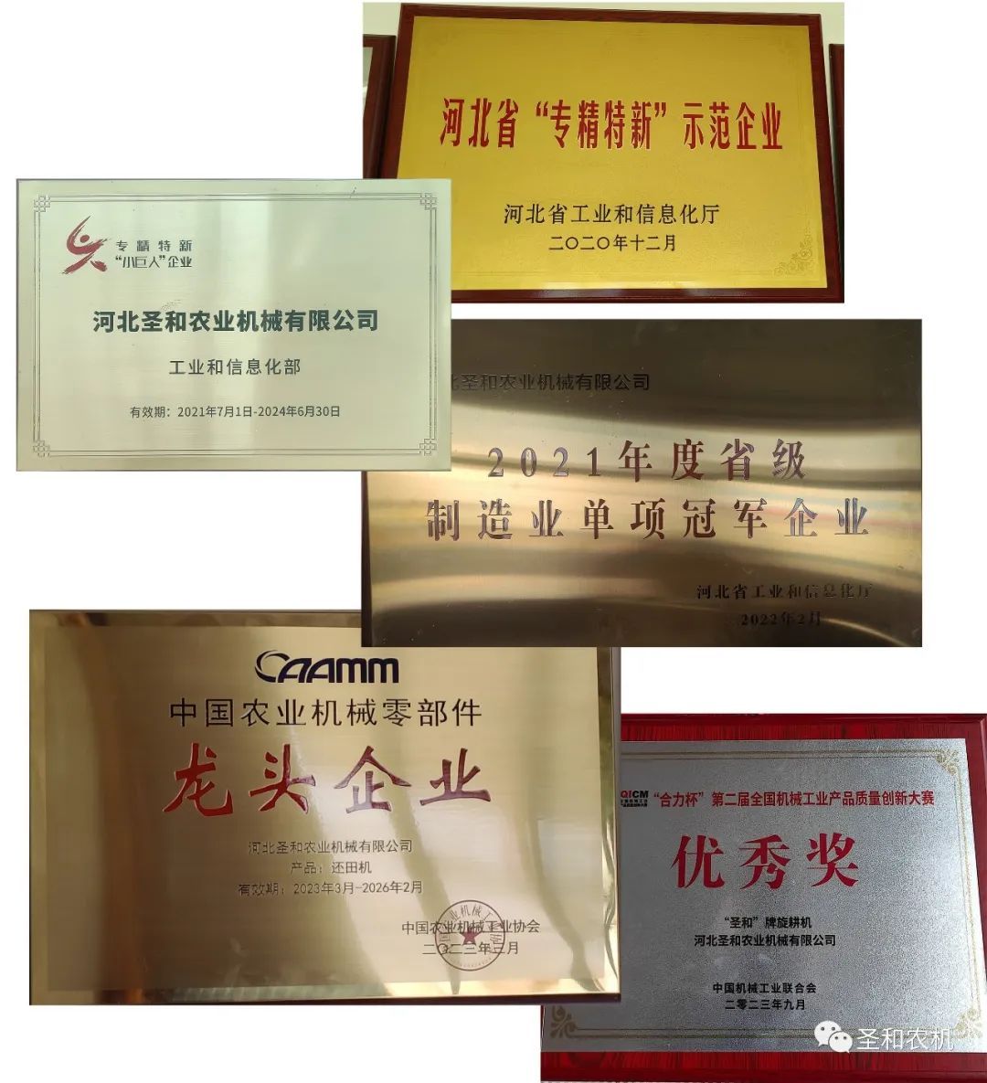 圣和公司為國家級專精特新“小巨人”企業(yè)、河北省“專精特新”示范企業(yè),2021年入選河北省民營企業(yè)社會責(zé)任100強(qiáng)企業(yè),河北省工業(yè)和信息化廳頒發(fā)的“2021年度省級制造業(yè)單項冠軍企業(yè)”。2022年圣和公司入選河北省首批縣域特色產(chǎn)業(yè)集群“領(lǐng)跑者”企業(yè)名單;2022年圣和牌旋耕機(jī)和還田機(jī)全國銷量第一;2023年中國機(jī)械工業(yè)聯(lián)合會第二屆全國機(jī)械工業(yè)產(chǎn)品質(zhì)量創(chuàng)新大賽圣和牌旋耕機(jī)榮獲“優(yōu)秀獎”;中國農(nóng)業(yè)機(jī)械工業(yè)協(xié)會評選為2023-2026年度“中國農(nóng)業(yè)機(jī)械零部件龍頭企業(yè)”。