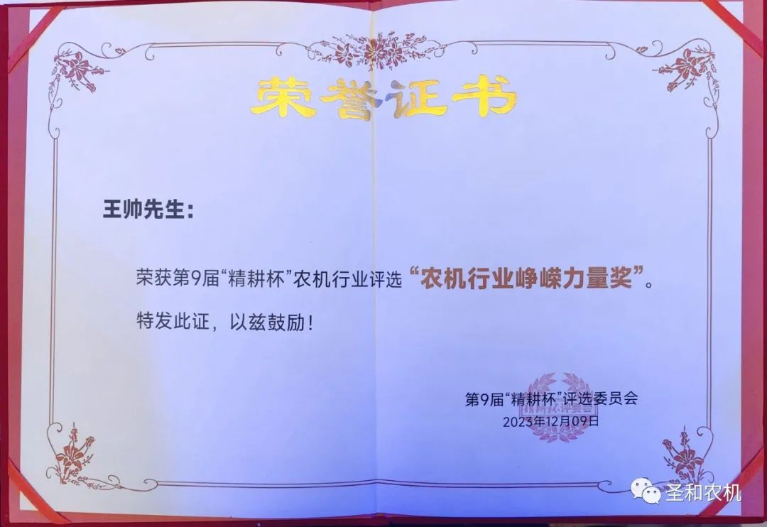 頒獎詞是評委會對王新芳董事長為農(nóng)機行業(yè)發(fā)展所做貢獻的高度概括和總結(jié);獲此殊榮,作為中國農(nóng)機行業(yè)的杰出代表,是行業(yè)對他卓越貢獻的肯定。功成名遂,值得我們學(xué)習(xí)和敬仰。 王新芳董事長的兒子王帥榮獲本屆精耕杯“農(nóng)機行業(yè)崢嶸力量獎”。評委會頒獎詞為:他虛心好學(xué),踏實肯干,他長期工作在生產(chǎn)一線,勤奮鉆研現(xiàn)代工藝技術(shù),主持攻克一系列工藝技術(shù)難題。他牽頭完成的旋耕機主要部件應(yīng)用機器人焊接技術(shù)攻關(guān),實現(xiàn)了旋耕機焊接工藝的技術(shù)突破,使公司生產(chǎn)效率大幅提升,產(chǎn)品質(zhì)量更加穩(wěn)定,為圣和公司跨越發(fā)展做出了突出貢獻。
