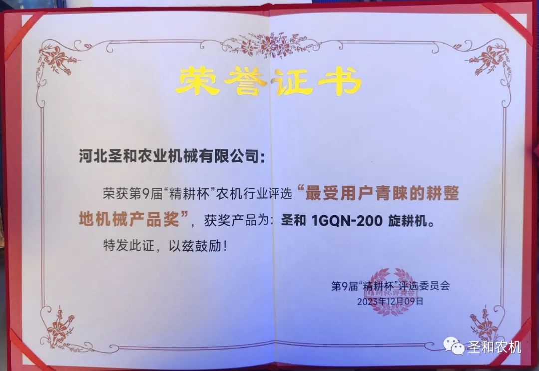 圣和品牌連續(xù)多年在“精耕杯”評選活動中屢獲殊榮。在本屆“精耕杯”評比中,“圣和”牌旋耕機再次憑借優(yōu)異的產(chǎn)品質(zhì)量、優(yōu)秀的售后服務(wù)、廣泛的群眾基礎(chǔ)、良好的用戶口碑,一舉奪得“最受用戶青睞的耕整地機械產(chǎn)品獎”!同時,也證明了圣和公司優(yōu)異的產(chǎn)品質(zhì)量、絕佳的全程服務(wù)得到了市場及用戶的青睞。
