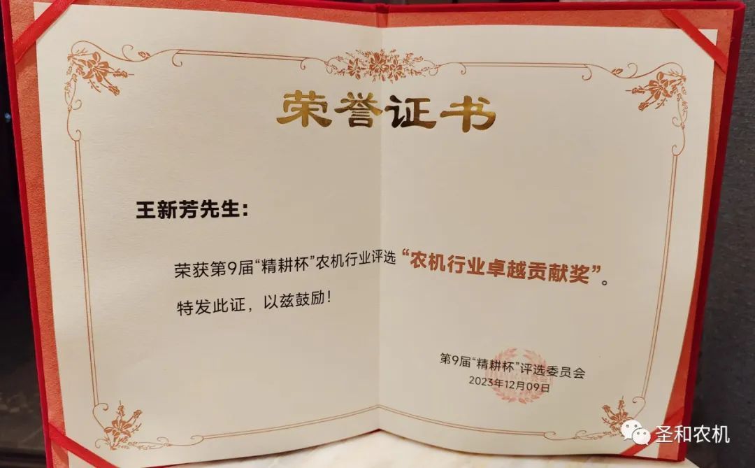 河北圣和農(nóng)業(yè)機械有限公司董事長王新芳榮膺本屆精耕杯“農(nóng)機行業(yè)卓越貢獻獎”。評委會頒獎詞為:他善于把握行業(yè)發(fā)展方向,有歷史使命感、有魄力。他心系“三農(nóng)”大膽創(chuàng)新,曾多次顛覆性、革命性地引導(dǎo)旋耕機的發(fā)展方向;他不忘初心,以實現(xiàn)農(nóng)機智能化、數(shù)字化為己任,籌建了河北省耕整地創(chuàng)新中心,推動了行業(yè)升級;他勇闖國際市場,打造“中國智造”新名片,30年在農(nóng)機行業(yè)默默奉獻,為中國農(nóng)機行業(yè)發(fā)展作出了卓越貢獻。