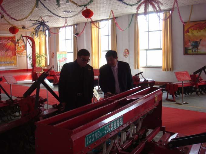 董事長王新芳(左二)向夏海榮站長(左一)介紹公司免耕播種機