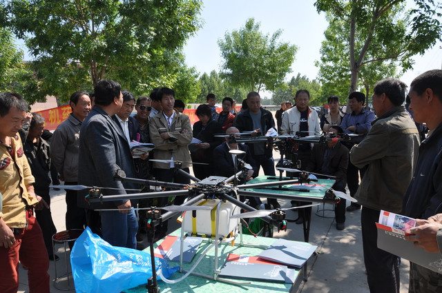 5月5日,我公司與西安鯤化聯(lián)合研制的無(wú)人植保飛機(jī)在晉州登場(chǎng)亮相,此次參觀試驗(yàn)的有晉州市劉市長(zhǎng)、石家莊市植保站王維蓮站長(zhǎng)、我公司董事長(zhǎng)王新芳、威遠(yuǎn)生化植保營(yíng)銷(xiāo)中心總經(jīng)理應(yīng)曉東等公司領(lǐng)導(dǎo)及當(dāng)?shù)卮迕窈秃献魃?0多人觀摩;在本次試驗(yàn)會(huì)上,展示的無(wú)人飛機(jī)一個(gè)用于小麥藥效防治工作、一個(gè)用于全程跟蹤航拍工作。
