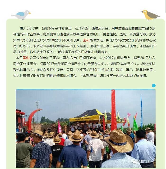 作為國家旋耕機標準起草單位、河北省著名商標、河北省優(yōu)質(zhì)產(chǎn)品、更是一家集生產(chǎn)、研發(fā)、流通為一體的科技型企業(yè),深松旋耕機、雙軸滅茬旋耕機安全標志及防護裝置示范單位”、“中國旋耕機協(xié)會理事長單位”、“中國農(nóng)業(yè)機械化協(xié)會會員單位”、“中國農(nóng)業(yè)機械流通協(xié)會理事單位”、“河北省生產(chǎn)與流通協(xié)會常務理事單位”、“河北工業(yè)大學機械工程學院-產(chǎn)、學、研合作基地”,擁有市級研發(fā)中心,公司一直致力于保護性耕整耕種機具的研發(fā),在中國農(nóng)機具研發(fā)領(lǐng)域取得特別優(yōu)異的成果,目前已經(jīng)有近百種的農(nóng)機產(chǎn)品在全國范圍內(nèi)享受農(nóng)機購置補貼,部分產(chǎn)品走出國際市場,遠銷海外,并受到一致好評。不斷更新,不斷完善,不斷進取......立足長遠發(fā)展于未來,圣和-您信賴的農(nóng)機品牌!買農(nóng)機、選圣和!