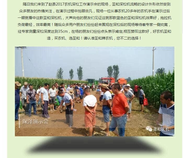 經(jīng)過輾轉(zhuǎn)我們又來到了深澤2017年秋季深松演示會的現(xiàn)場為您帶來一線現(xiàn)場的深松、耕整盛況:多家玉米收獲機演示過后,觀眾為接下來的耕整機械吊足了胃口,圣和1SS-270型深松機閃亮登場,氣質(zhì)不凡的“小伙兒”蓄勢待發(fā),一口氣卯足了勁,三加五除二的快速深松過去,現(xiàn)場觀眾還沒來得及過足癮就完成任務!此前多位農(nóng)民朋友就已經(jīng)有意選購如此如意產(chǎn)品,都在等待這場令人矚目和期待的演示會,看到如此演示效果,笑容變得更加燦爛,紛紛表示再來一圈!經(jīng)過大伙的測量深松深度達到了將近38cm左右!在隨后普勞恩德(河北)農(nóng)業(yè)機械有限公司生產(chǎn)的普勞恩德PLAUERN旋耕機受到朋友們的高度關(guān)注,它采用德國技術(shù),實現(xiàn)了旋耕機質(zhì)的飛躍---采用流線型設(shè)計,零部件靜電等離子噴涂,整機流水線組裝,加工時依靠工裝、模具保證零部件的尺寸精度(側(cè)板沖壓成型、一次沖孔;刀軸焊后加工;主梁焊后加工),從而保證了整機裝配精度;上蓋板為圓弧活蓋式,使刀軸回轉(zhuǎn)上腔體空間加大,作業(yè)中甩起的泥土不易粘結(jié),同時有利于維修保養(yǎng);采用加重型刀庫,精密鑄造成型;采用日本進口刀片,持久耐用。廠內(nèi)安裝刀片,交付用戶以后,不用再為刀片錯裝而煩惱。變速箱逐臺進行磨合試驗,刀軸旋轉(zhuǎn)靈活,旋耕機作業(yè)時可節(jié)省8~10馬力。刀軸采用機器人焊接,雙層迷宮槽式防塵罩,有效保護軸承不受惡劣作業(yè)環(huán)境的影響,延長了使用壽命。加寬后托板,確保達到最佳平地效果。防磨板采用加寬、加大結(jié)構(gòu),可根據(jù)地域要求選擇配裝。側(cè)板兩側(cè)可選裝切草刀,斬斷、分離工作中堆積的草團。整機覆膜、木箱包裝,既保護了整機外觀的亮麗如新,又節(jié)省了運輸、儲存空間。真是買不知道,不用不知道,此次演示會獲得了眾多農(nóng)機合作社和老機手的充分肯定,圣和農(nóng)機以真實的用戶體驗,完美的演示效果讓在場的每個人都心悅誠服。