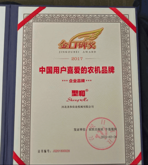 圣和公司等全國30個(gè)產(chǎn)品品牌分別獲得“中國用戶喜愛的農(nóng)機(jī)品牌”榮譽(yù)稱號,并上臺領(lǐng)獎(jiǎng)。圣和代表發(fā)言:獲獎(jiǎng)是全體圣和人辛勤耕耘的碩果,但獲獎(jiǎng)只是代表過去。圣和人要把今天的成就作為明天繼續(xù)進(jìn)步的動(dòng)力,不斷創(chuàng)新產(chǎn)品,不斷提升質(zhì)量,為國家鄉(xiāng)村振興大業(yè)精心發(fā)力,農(nóng)民的期待是我們的發(fā)展方向。