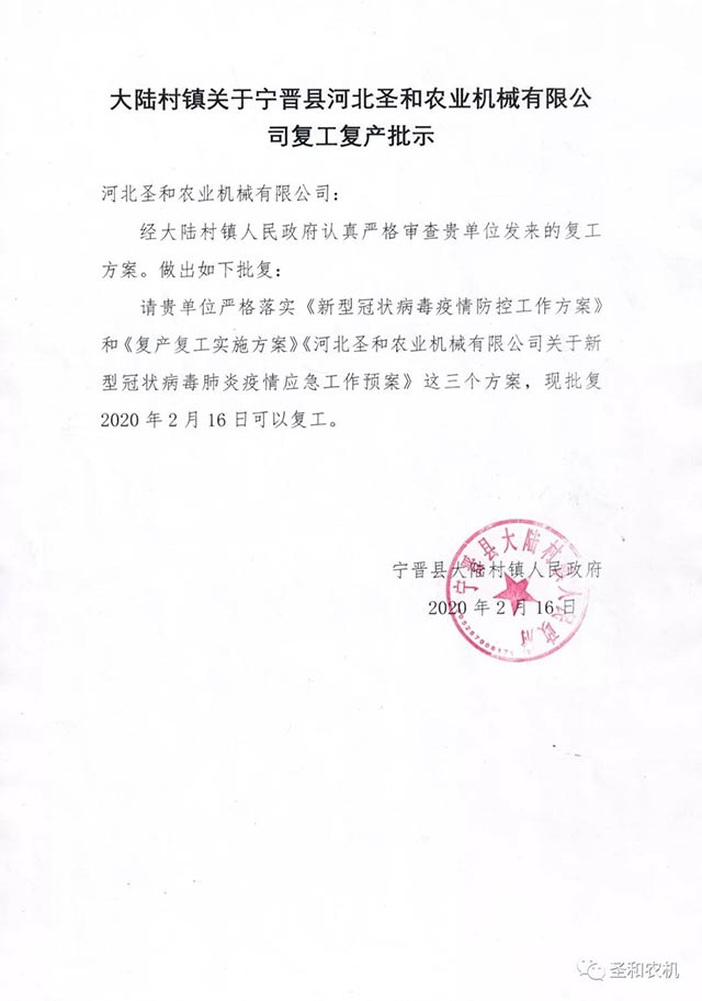 日前,寧晉縣大陸村鎮(zhèn)人民政府已批示河北圣和農(nóng)業(yè)機(jī)械有限公司在2月16日復(fù)工。