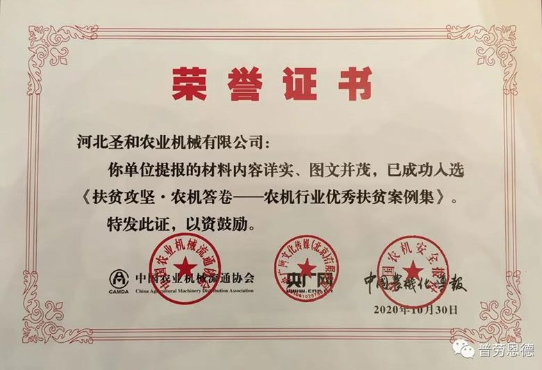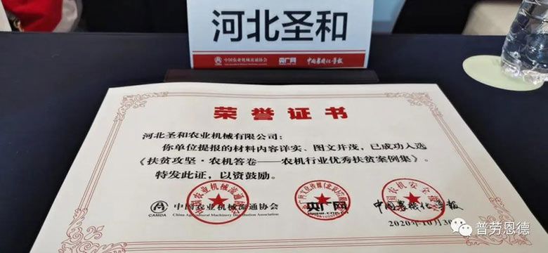 《農機行業(yè)優(yōu)秀扶貧案例集》,入選案例榮譽證書頒發(fā)儀式同期舉辦!圣和是唯一入選的河北生產企業(yè)!