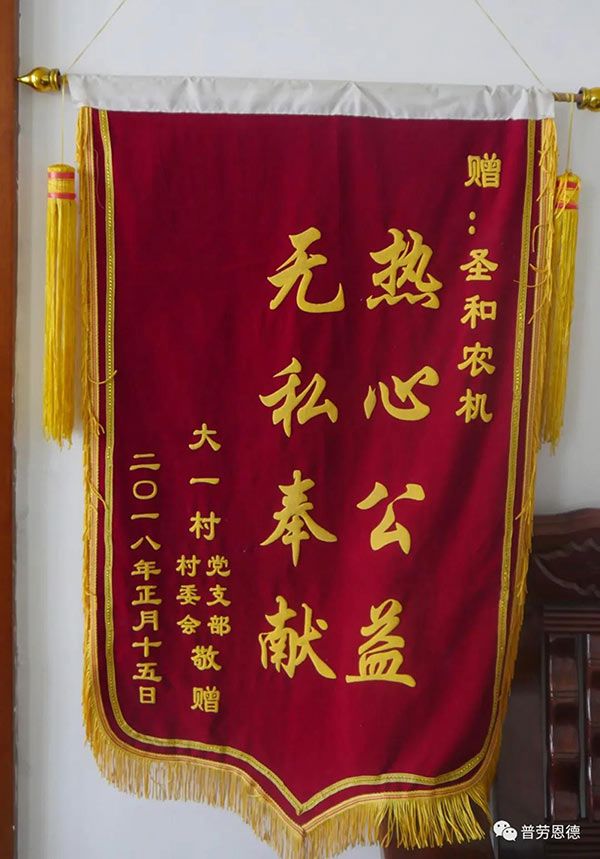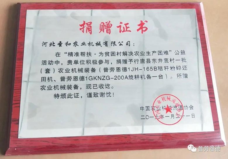 3、2019年12月21日,在“精準幫扶·為貧困村解決農業(yè)生產困難”公益活動中,河北圣和農業(yè)機械有限公司捐贈予行唐縣東井底村普勞恩德1JH-165B秸稈粉碎還田機、普勞恩德1GKNZG-200A旋耕機各一臺。