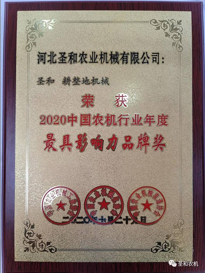 11月13日,“2020中國農(nóng)機(jī)行業(yè)年度大獎(jiǎng)?lì)C獎(jiǎng)儀式”在青島世界博覽城國際會(huì)展中心舉辦,河北圣和農(nóng)業(yè)機(jī)械有限公司“圣和”品牌榮獲最具影響力品牌獎(jiǎng),也是全國農(nóng)機(jī)行業(yè)耕整地機(jī)械類唯一獲獎(jiǎng)企業(yè)品牌。