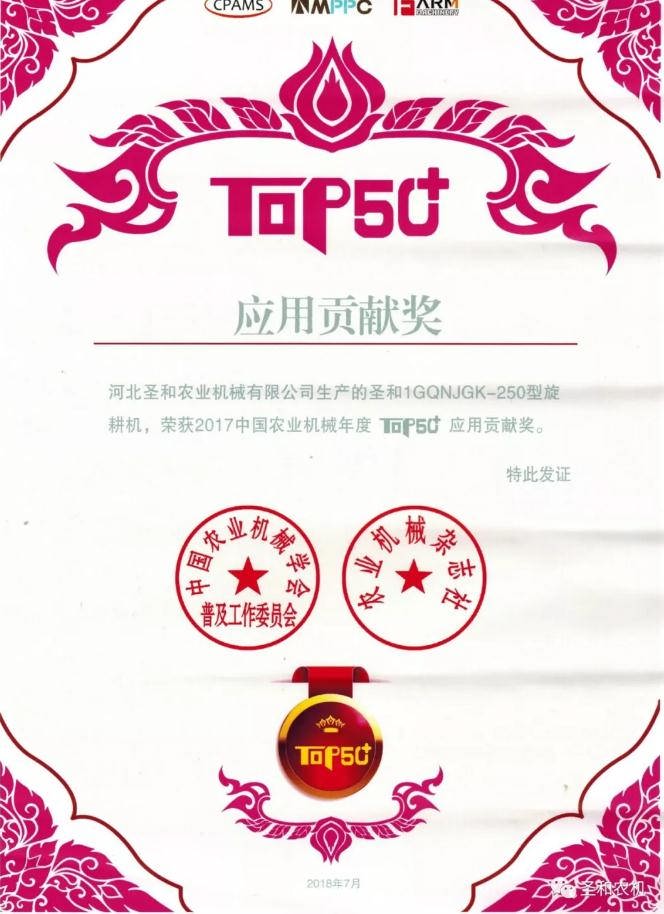 與此同時(shí),在“2017中國農(nóng)業(yè)機(jī)械年度產(chǎn)品TOP50”評(píng)選活動(dòng)中(以下簡稱“TOP50+”)評(píng)選活動(dòng),圣和公司作為中國耕整地知名企業(yè),憑借1GQNJGK系列-250型旋耕機(jī)榮獲2017中國農(nóng)業(yè)機(jī)械年度TOP50+應(yīng)用貢獻(xiàn)獎(jiǎng)。